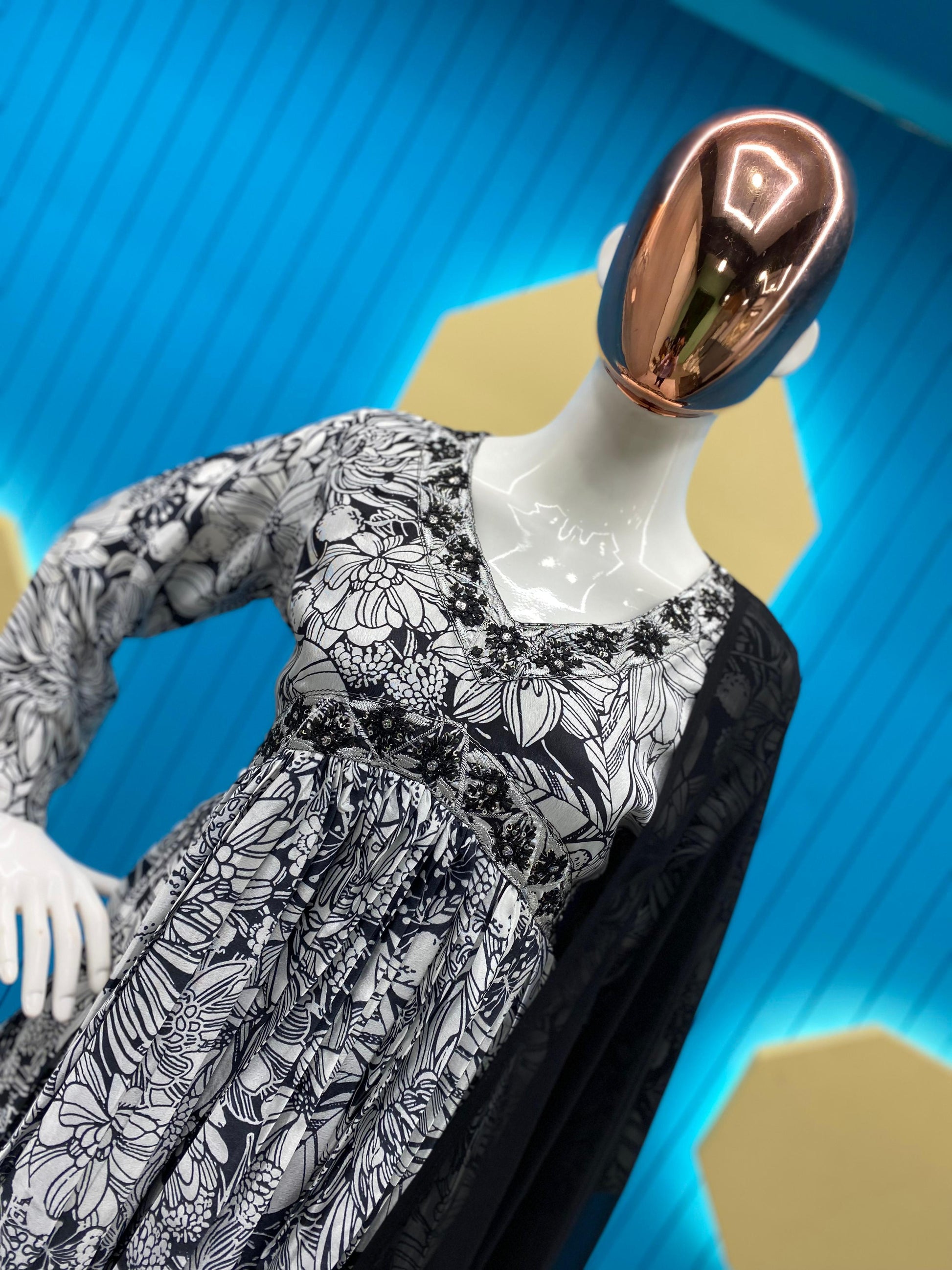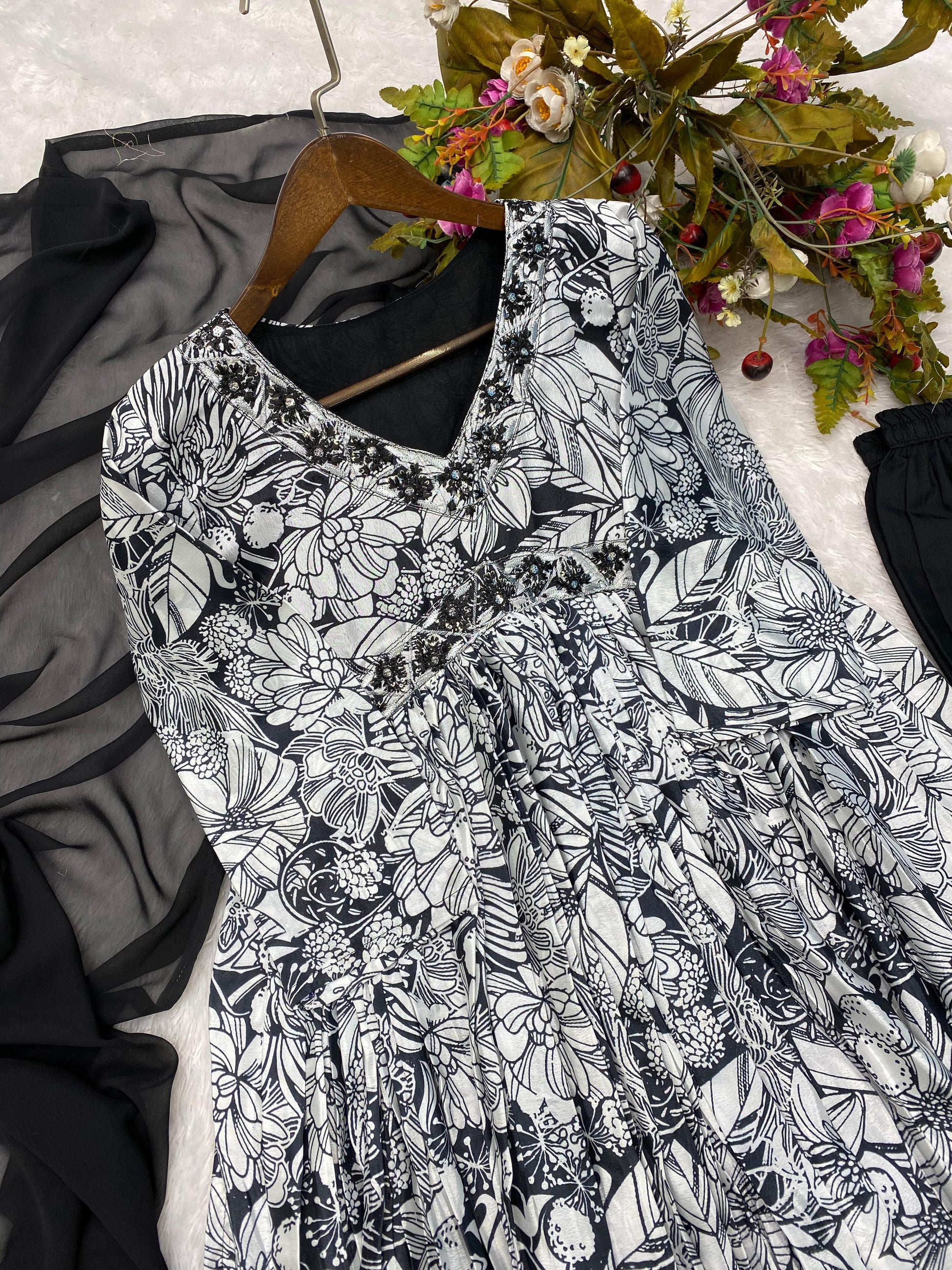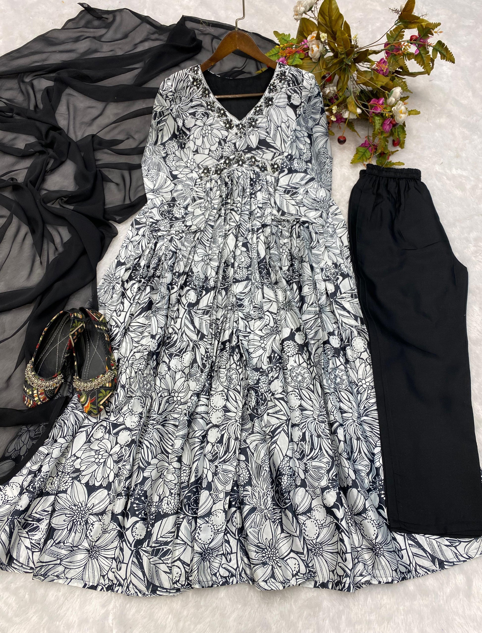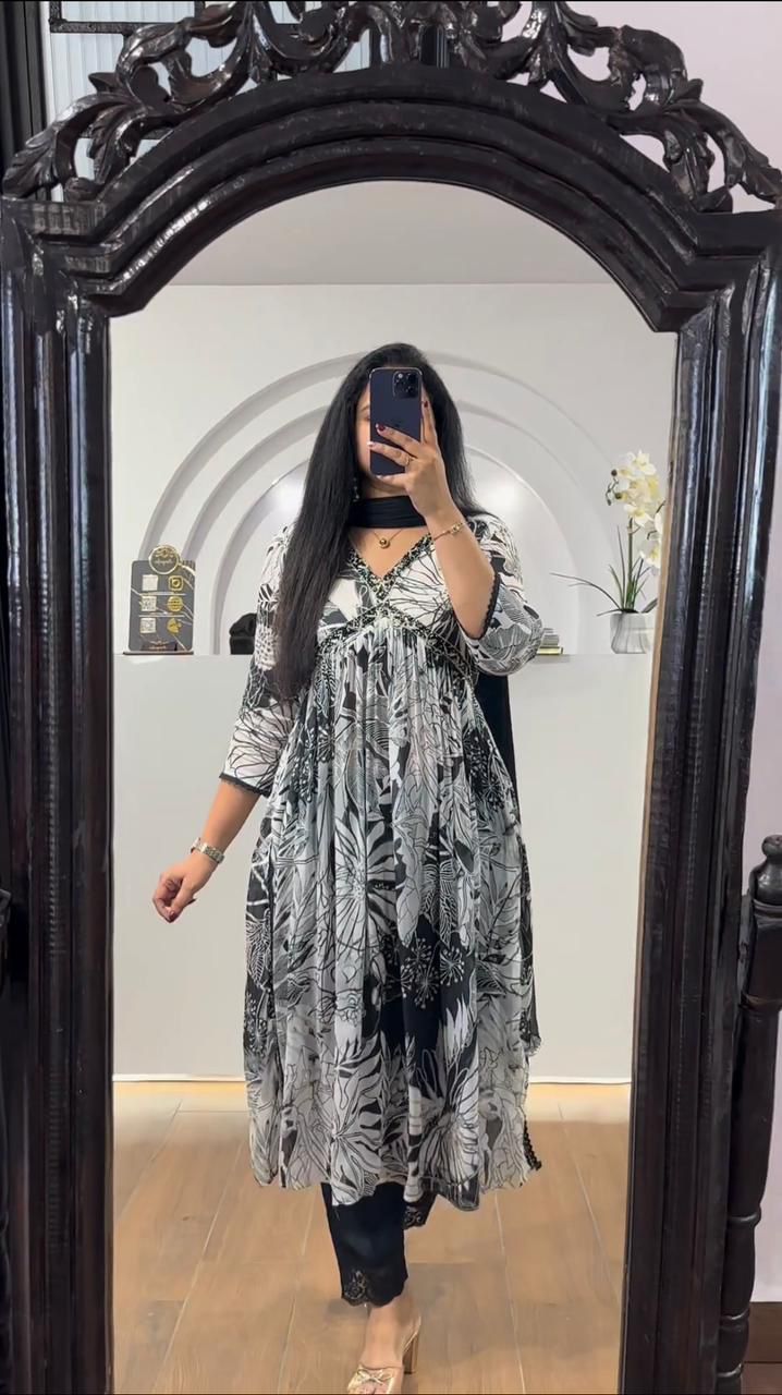 Trendy Black And White Color Sequence Work Printed Aliya Cut Suit