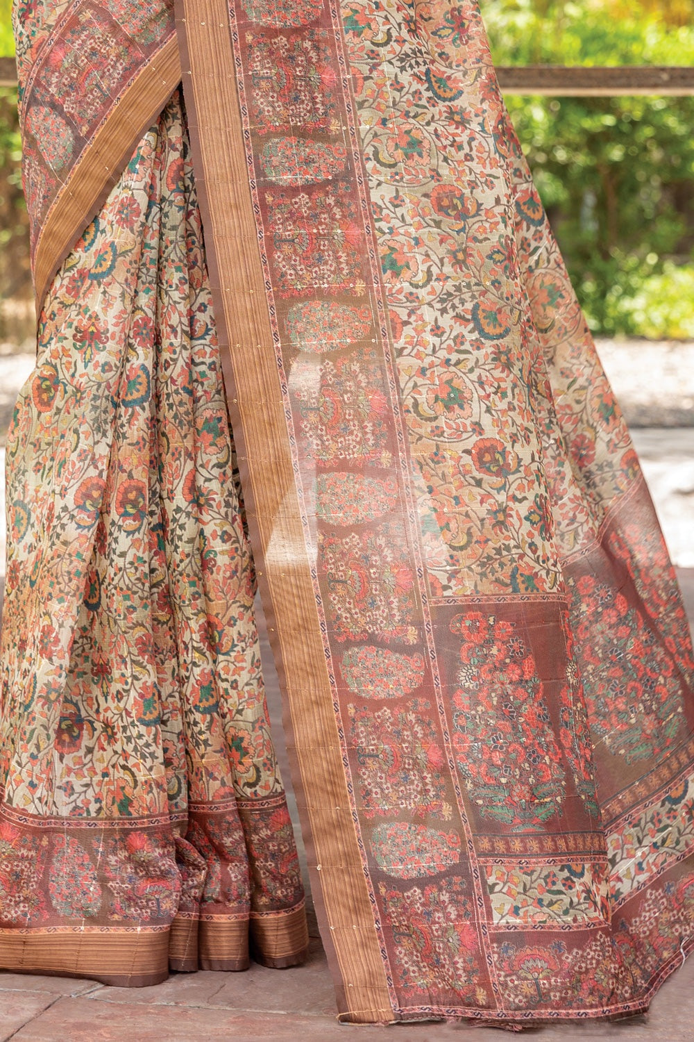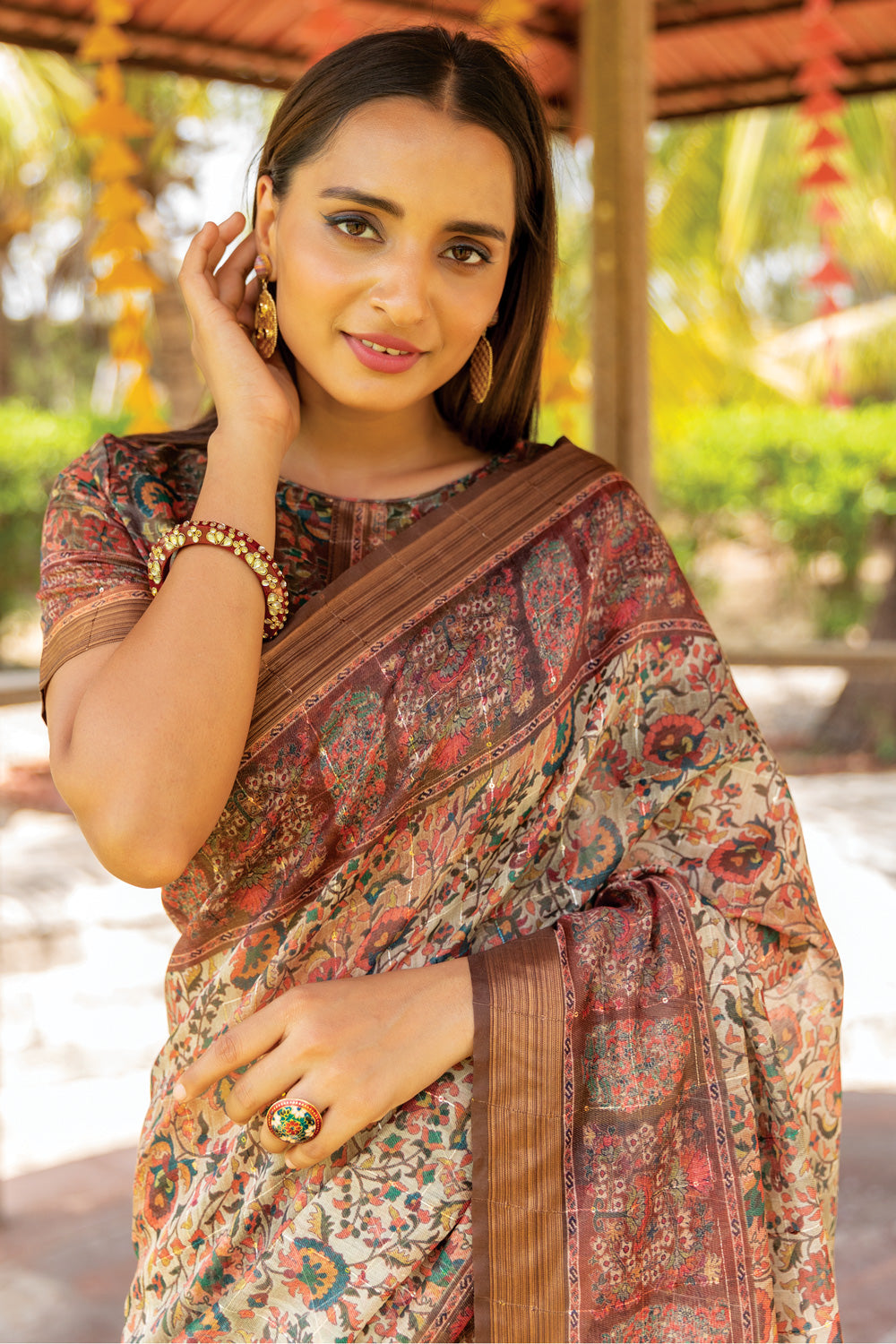 Trendy Brown Color Pure Cotton Lilen With Digital Printed Designer Saree