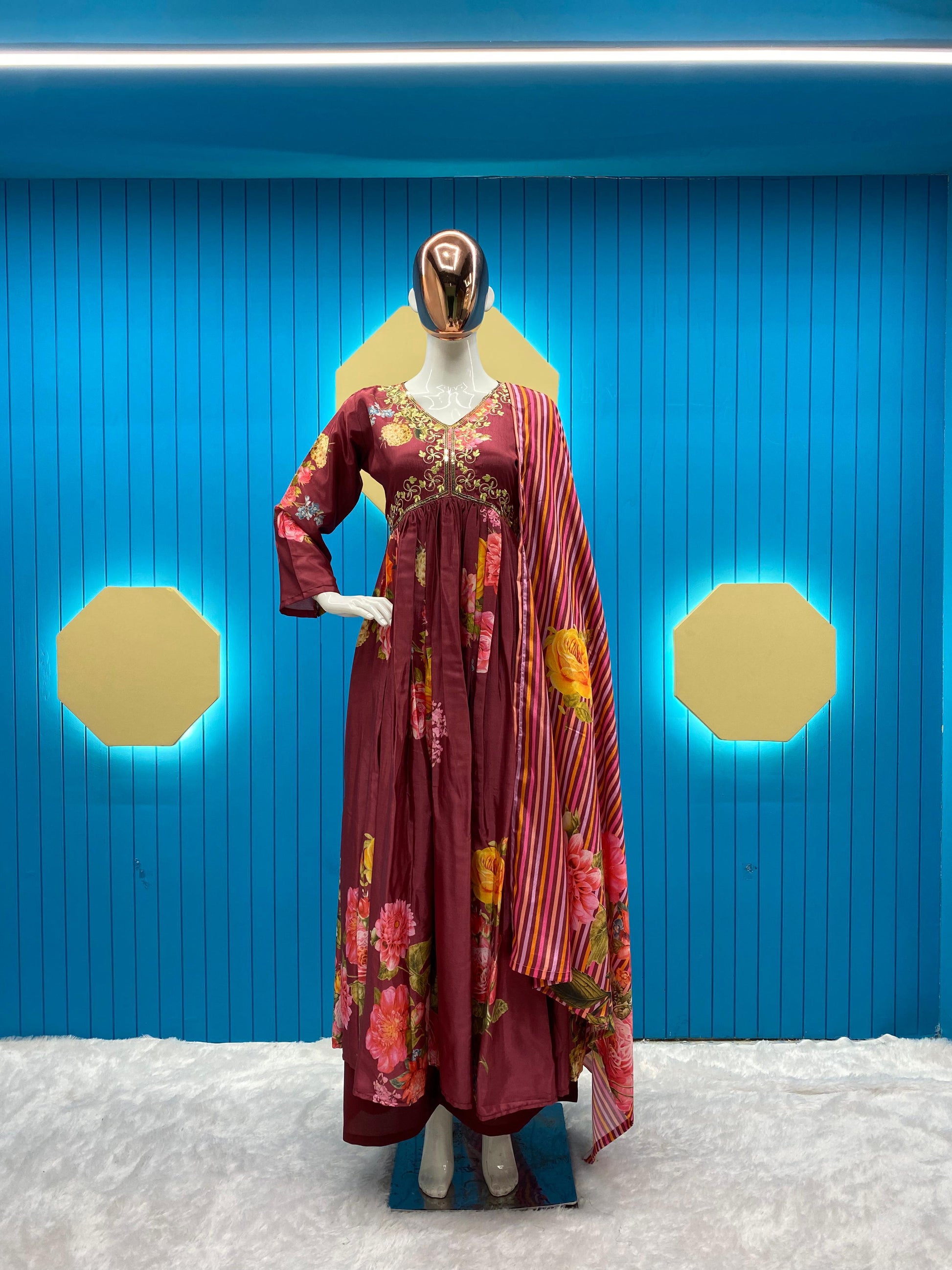 Trendy Work With Print Maroon Color Aliya Cut Suit