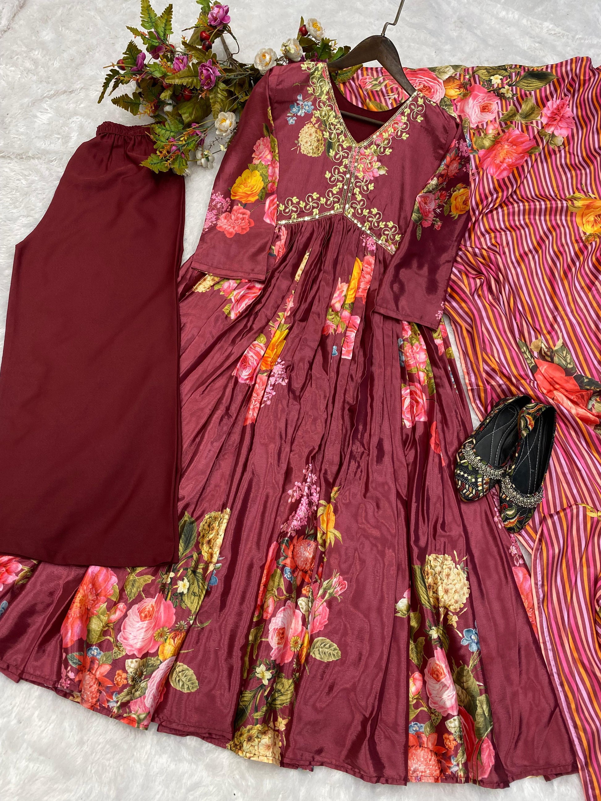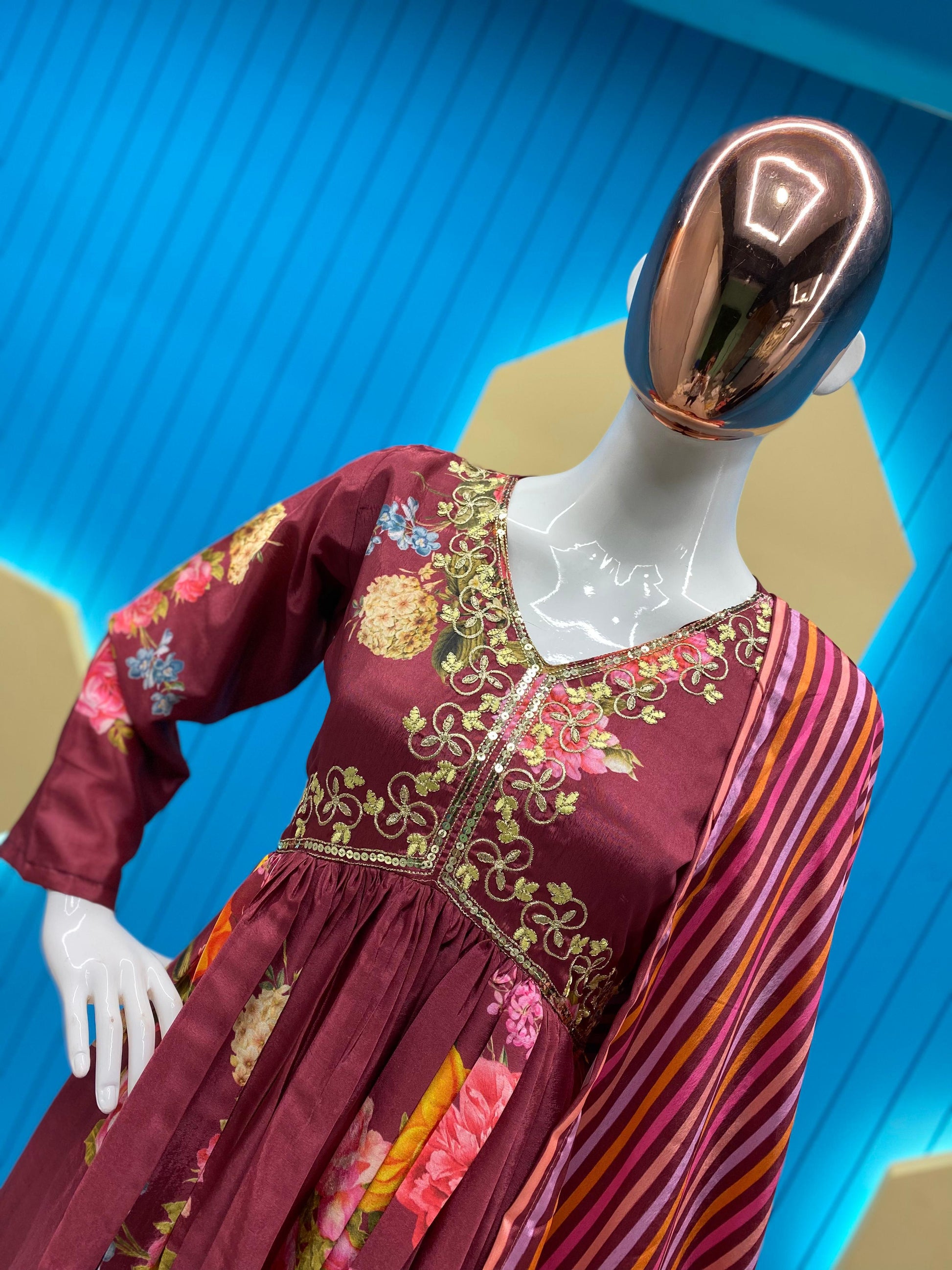 | Fabric | Chinon Print And Sequence Embroidery Work And 3meter Flair With Sleeves |