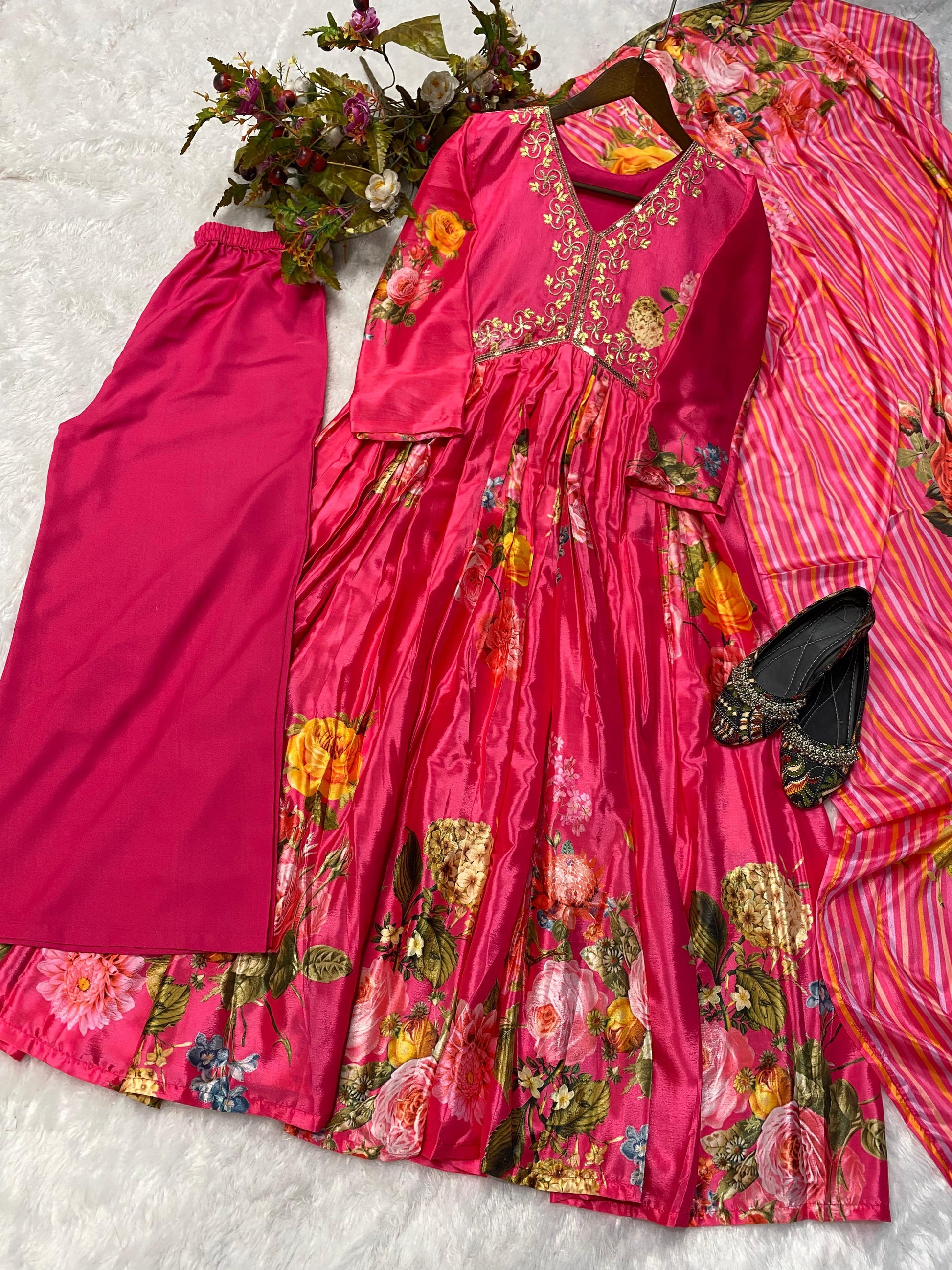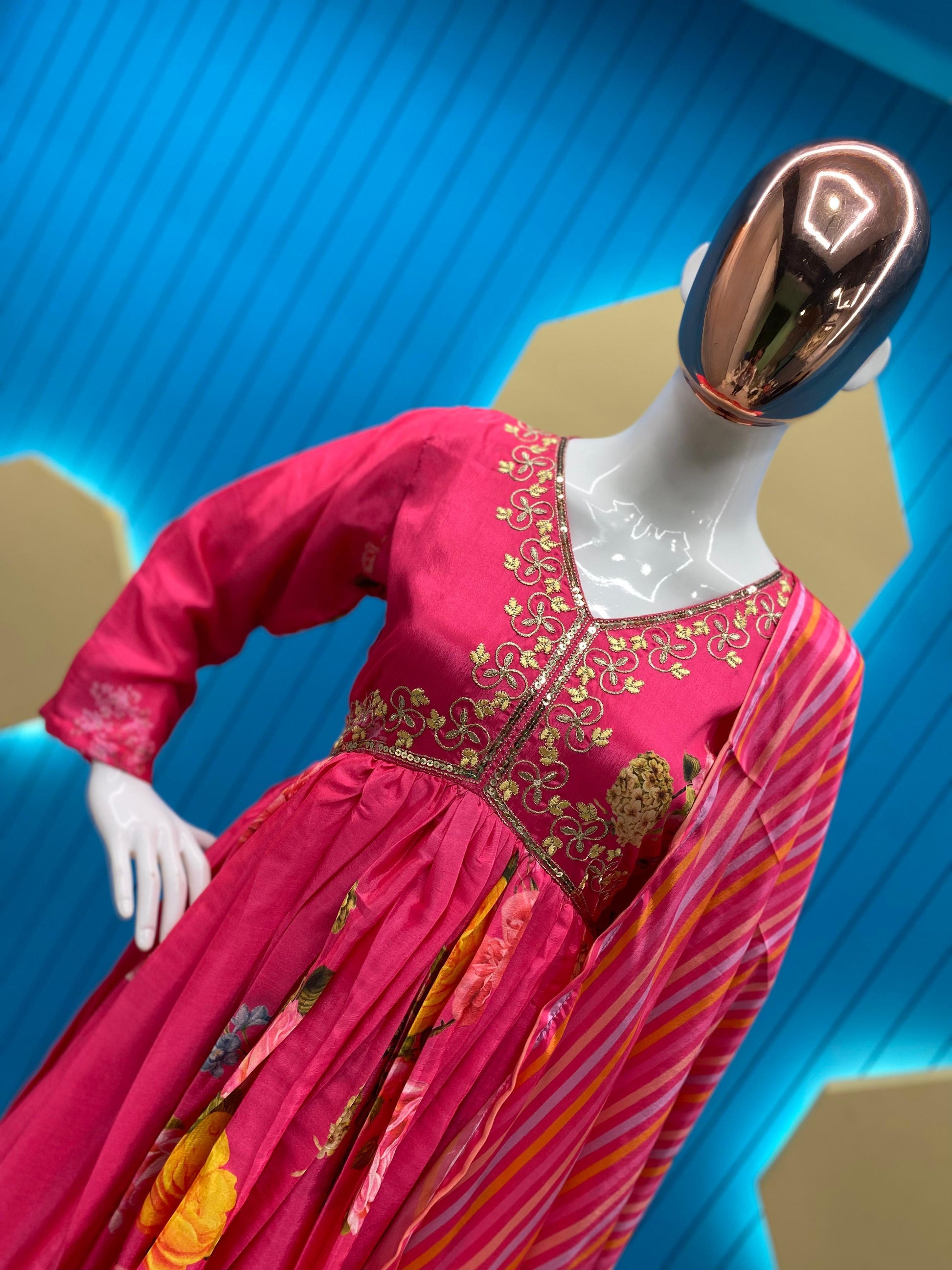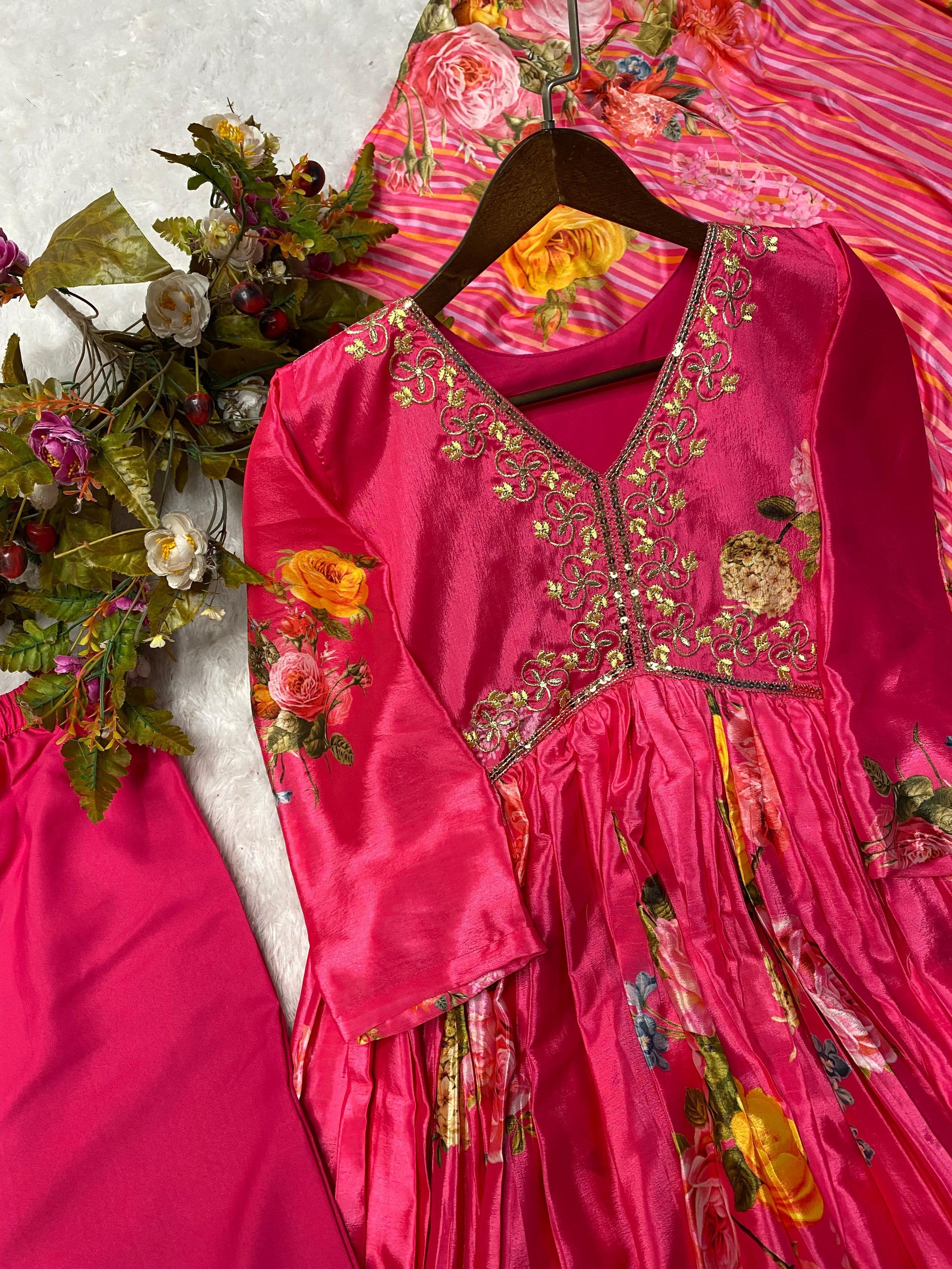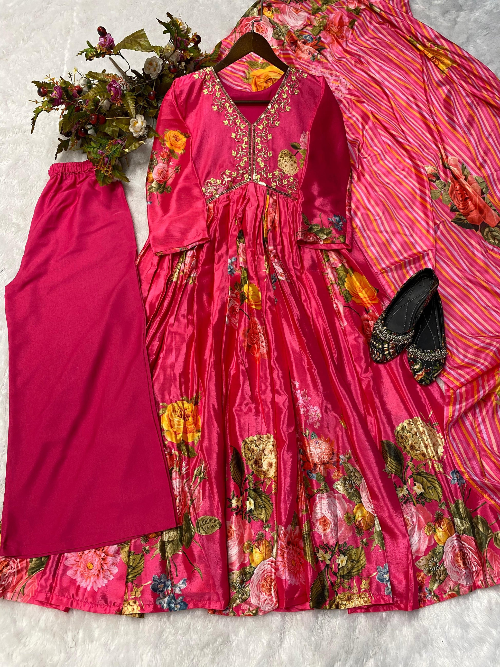 | Fabric | Chinon Print And Sequence Embroidery Work And 3meter Flair With Sleeves |