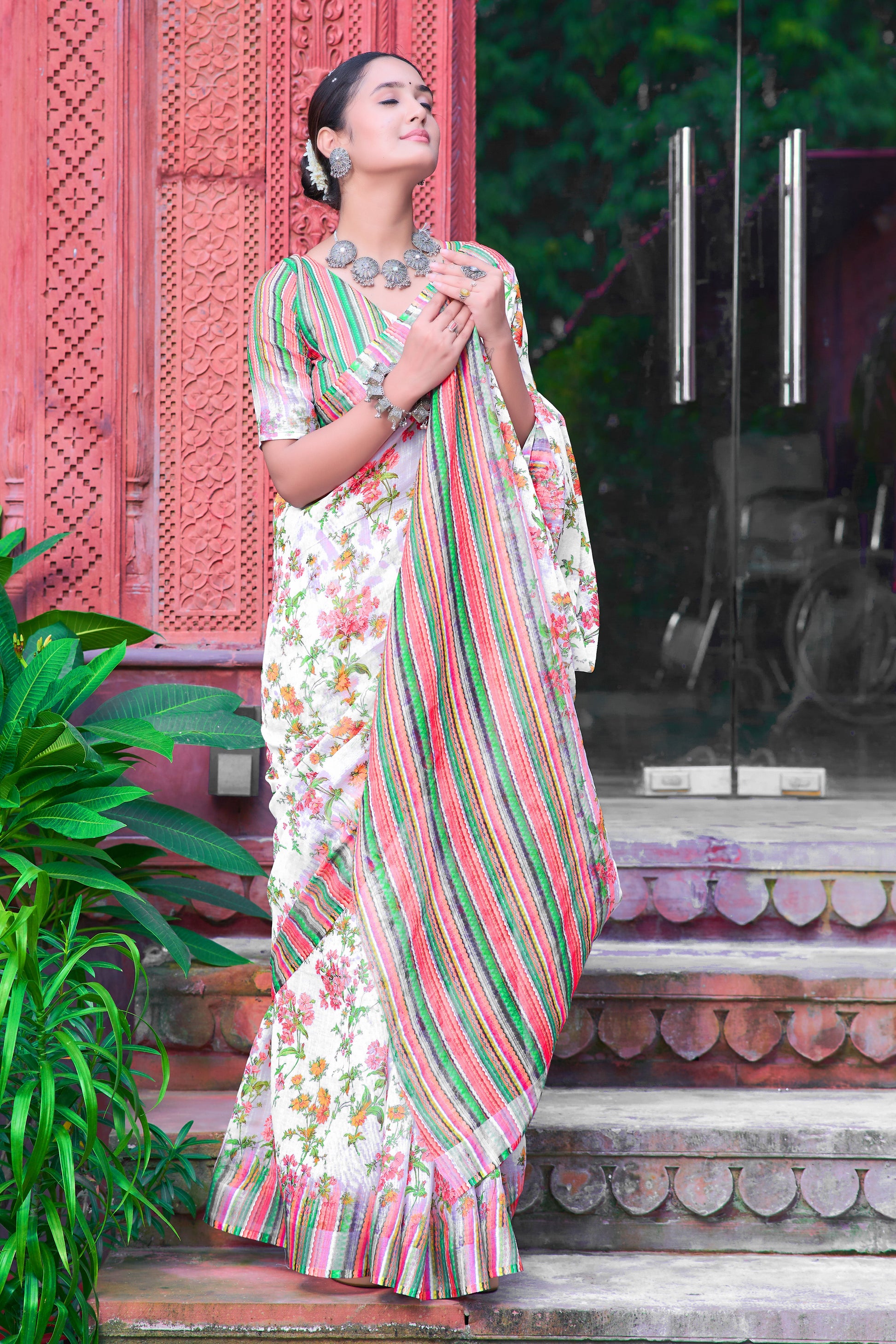 Unique Cream Color Color Pure Cotton Lilen With Digital Printed Designer Saree