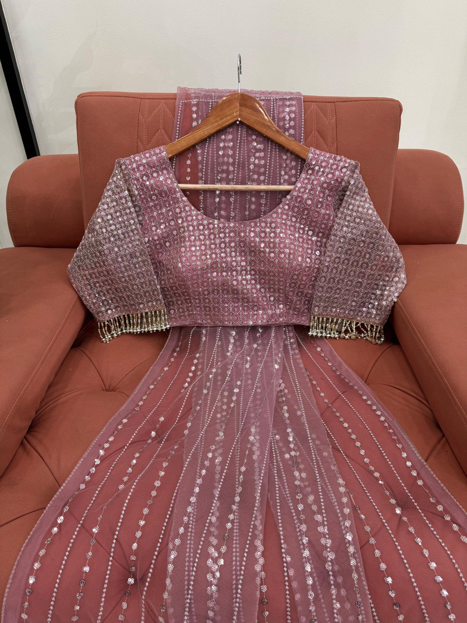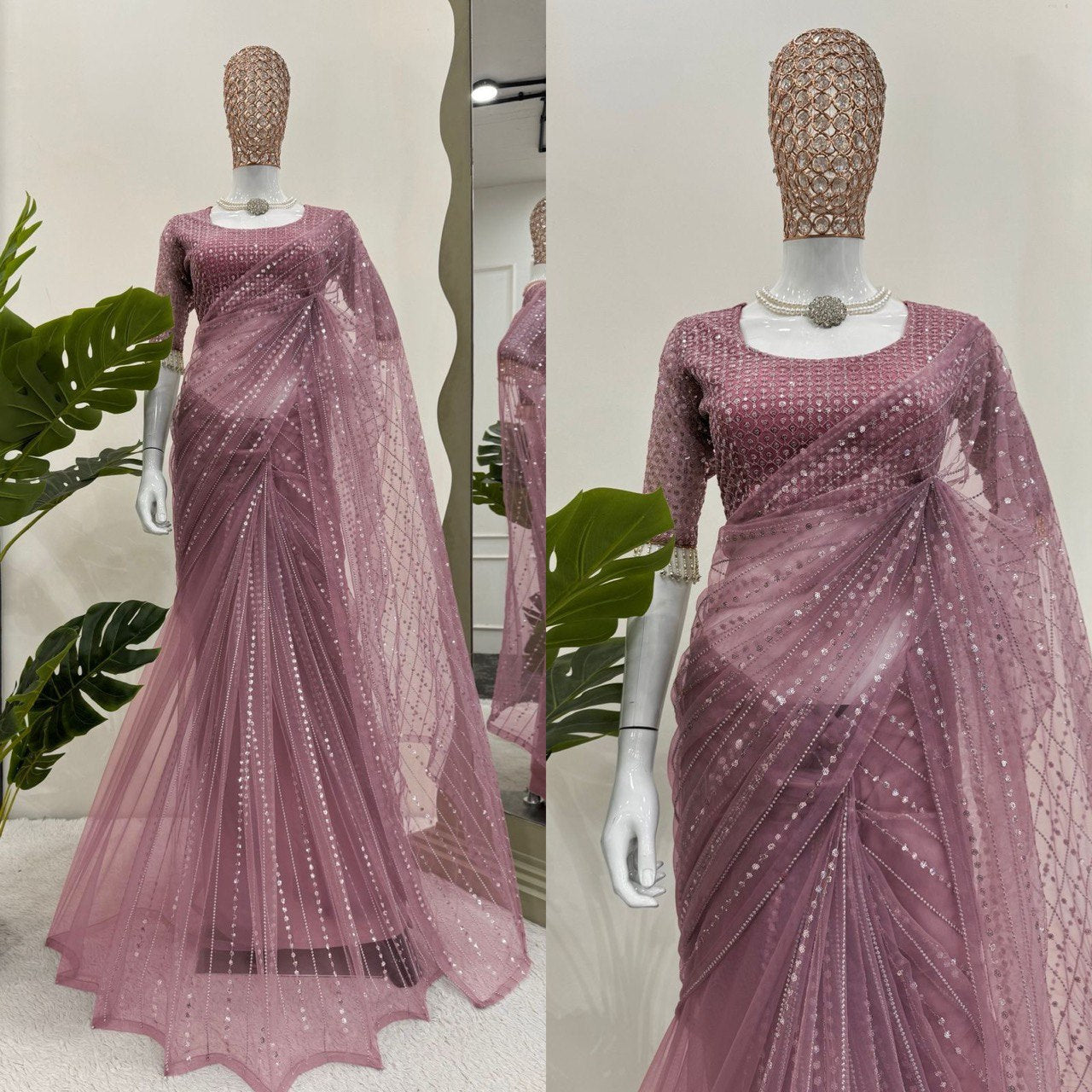 Step Into Timeless Elegance With This Beautiful Designer Saree Crafted In Premium Soft Net Fabric. The Saree Is Gracefully Embellished With Delicate Thread And Sequin Embroidery, Adding A Subtle Sparkle To Your Look.
