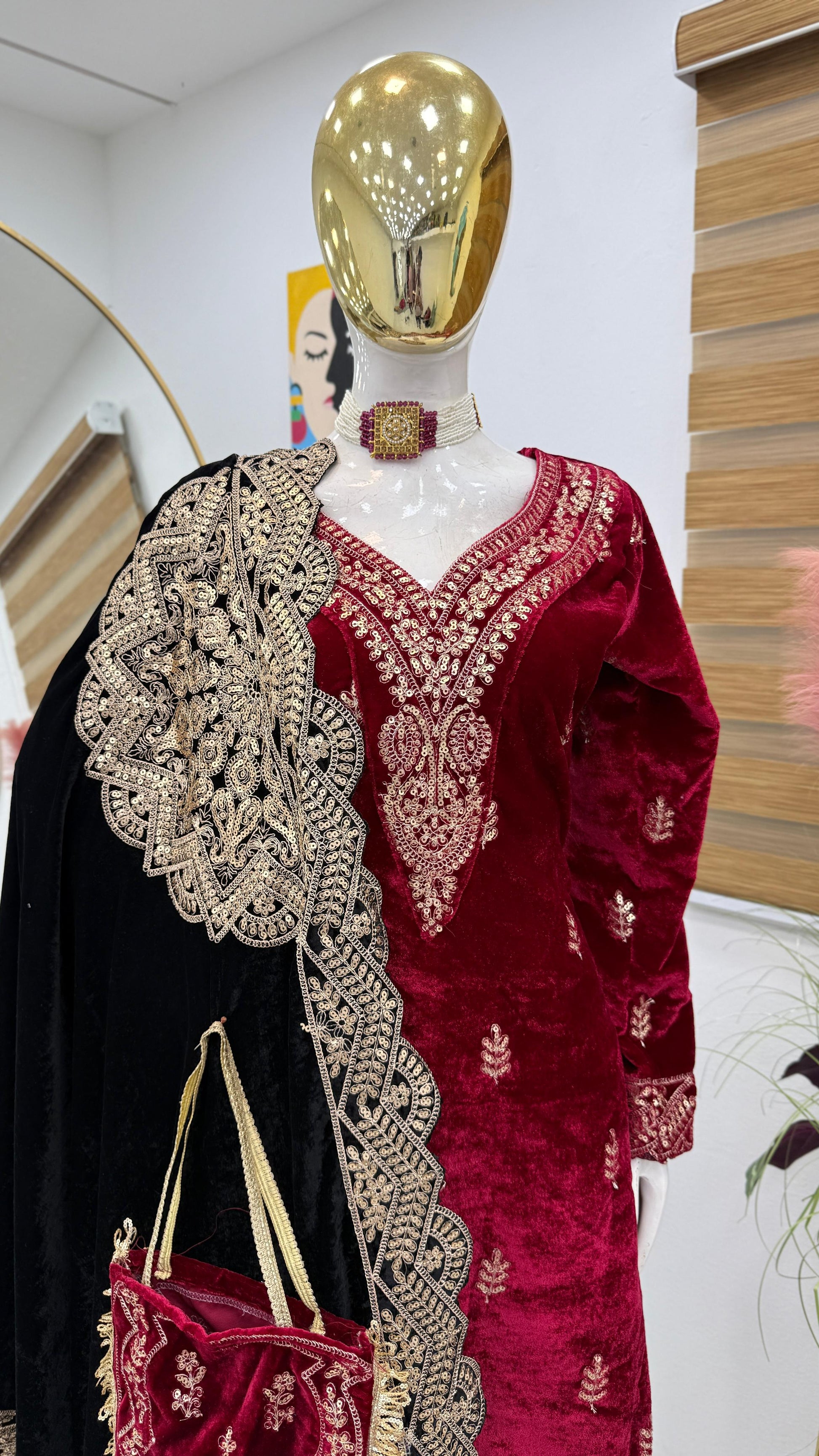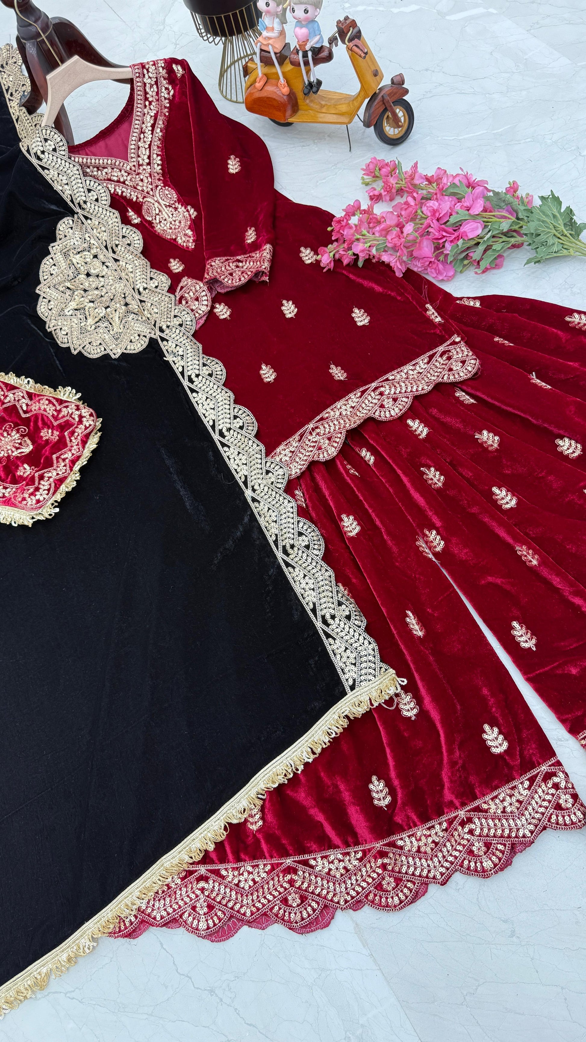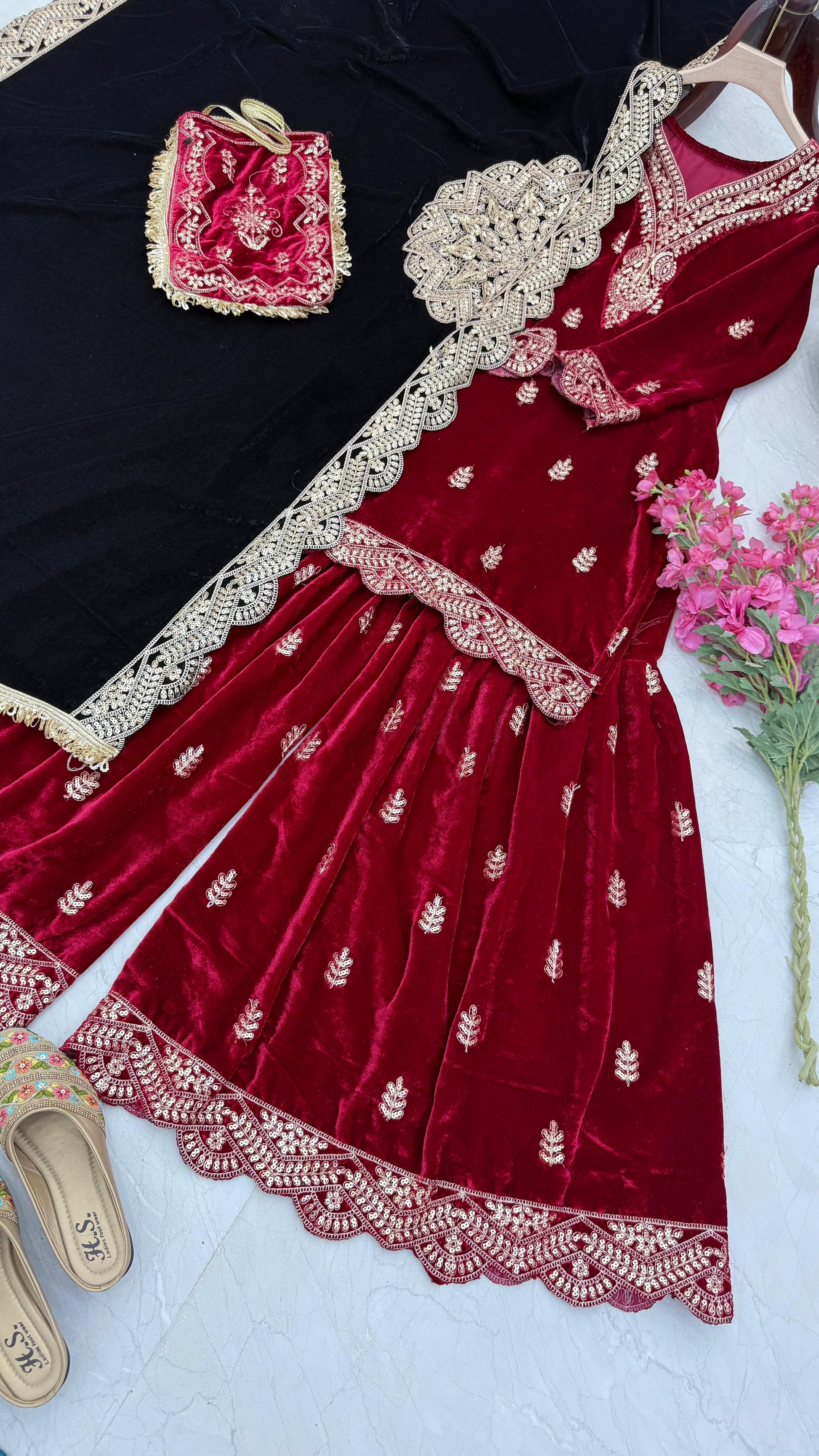 Wedding Wear Maroon Color Velvet With Embroidery Codding sequence Work Designer Sharara Suit