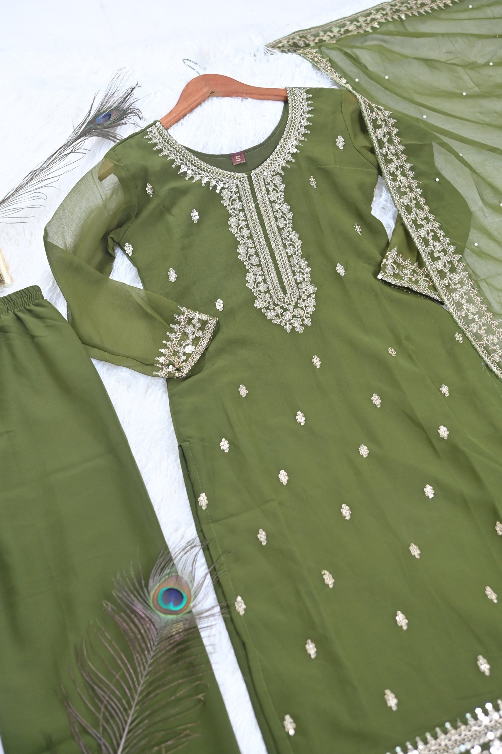 Wedding Wear Mehndi Green Color Faux Georgette And Sequence Embroidery Work Beautiful Salwar Suit