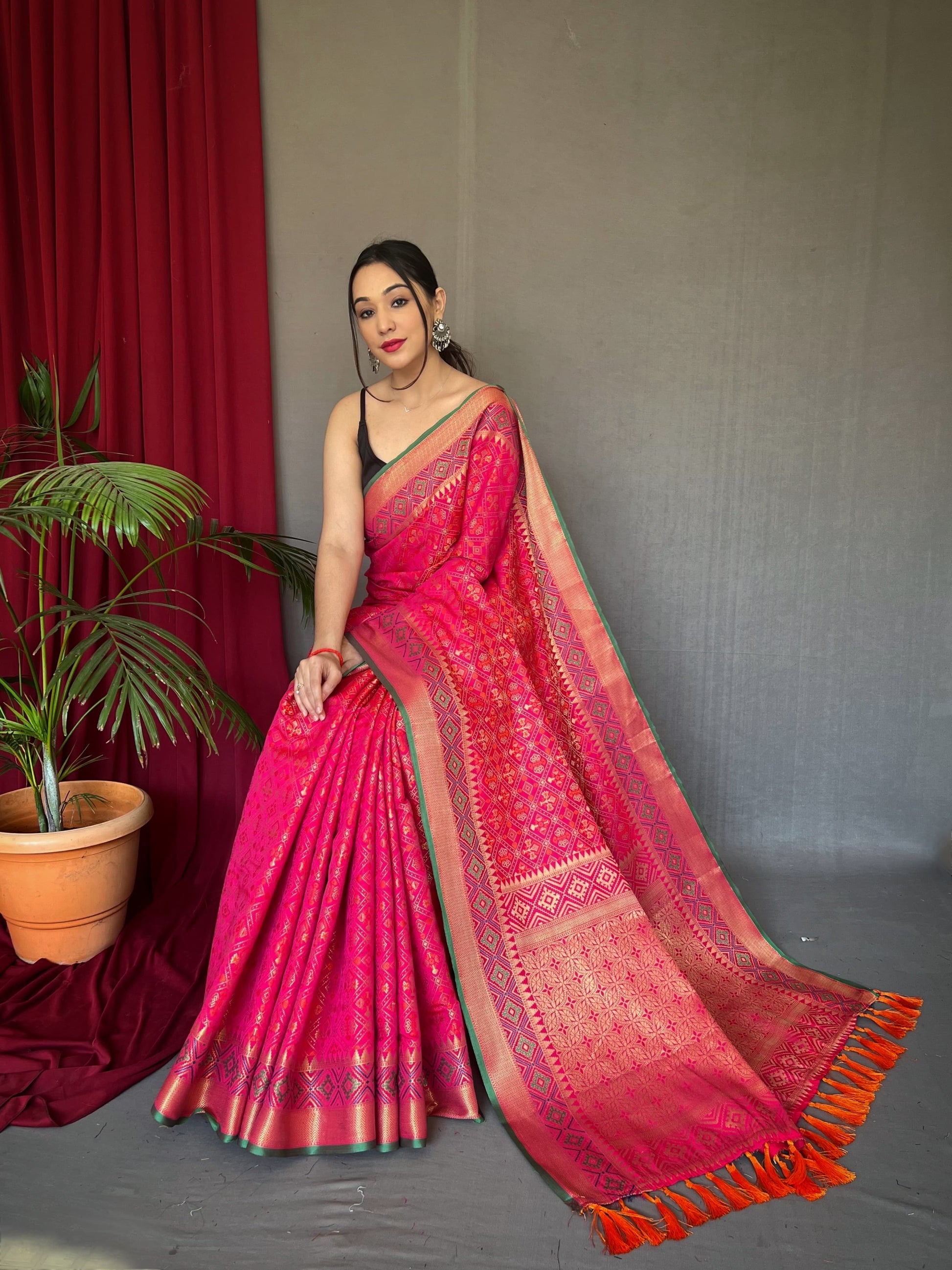 Pure Patola Silk Saree With Patola Fusion All Over Contrast Patola Weaved With Contrast Meenakari And Rich Pallu With Tassels Attached