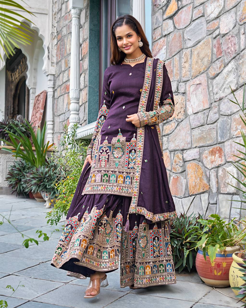 Wedding Wear Purple Color Embroidery With Coding Dori And Sequence Work Palazzo Suit