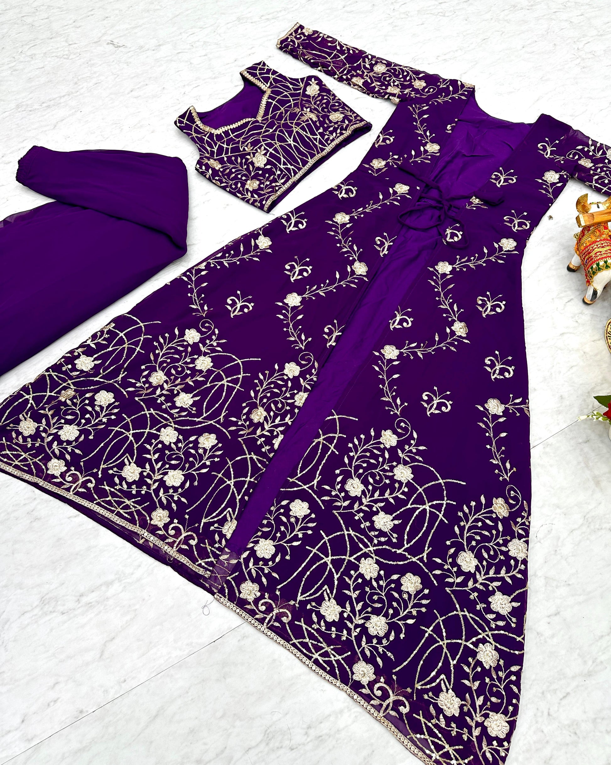 Wedding Wear Purple Color Faux Georgette With Heavy 3mm Embroidery Work Designer Palazzo With Choli And Shrug