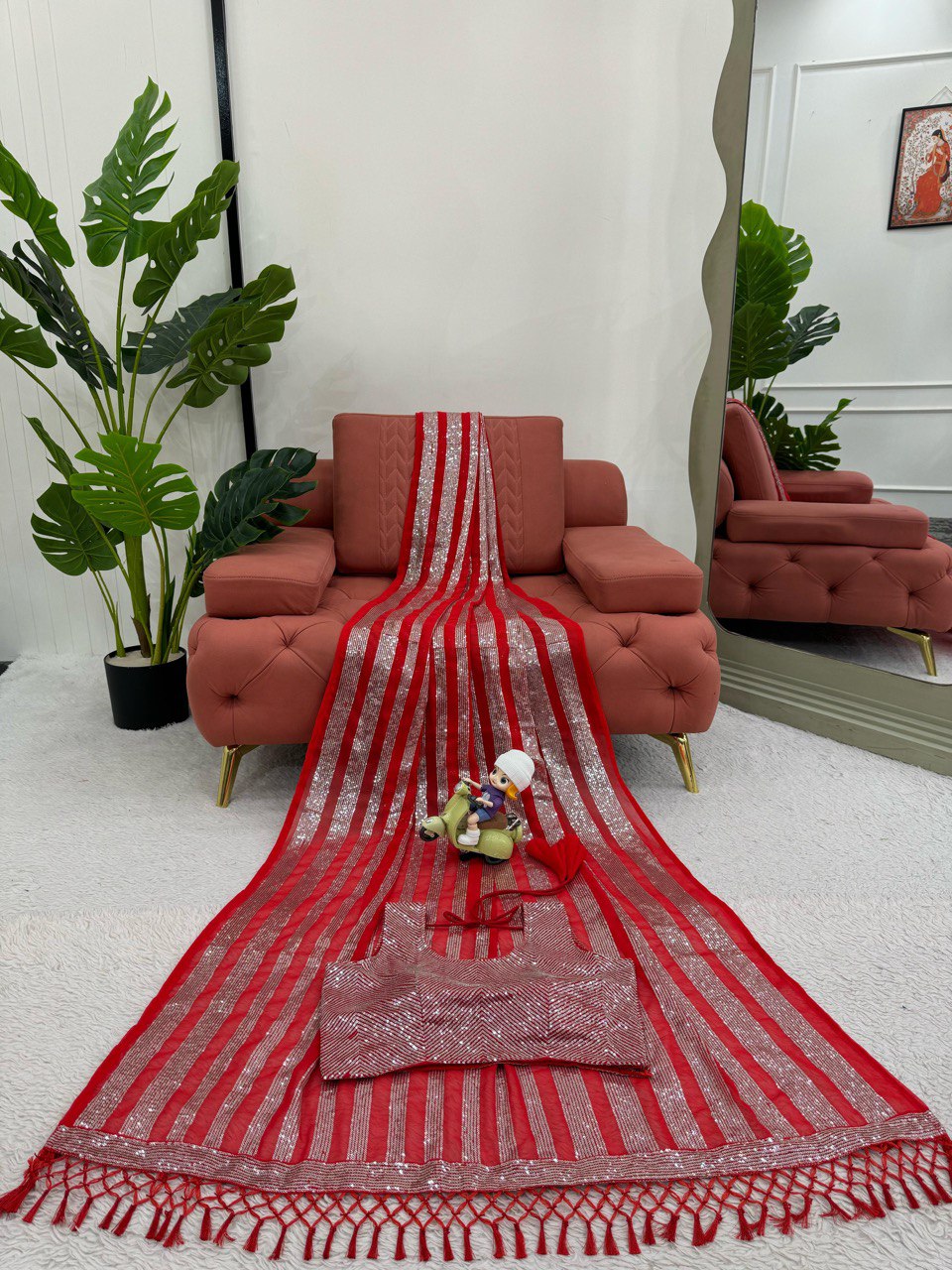 Wedding Wear Red Color Faux Georgette Thread And Sequence Work Saree