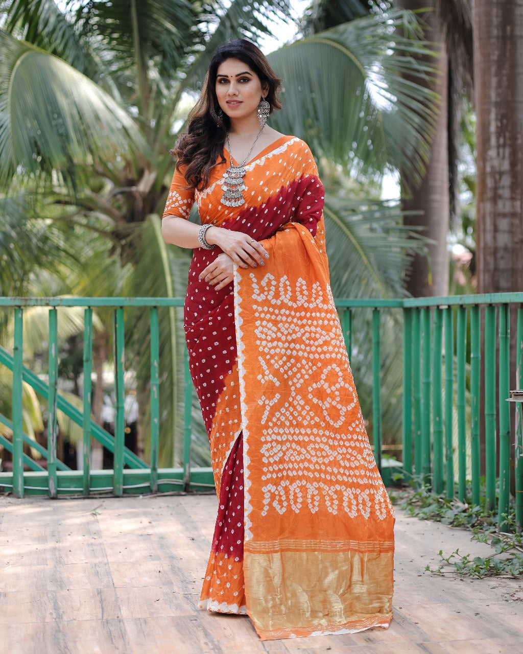 Pure Bandhej Silk Saree Made By *Original Bandhej With Bandhej Border With Zari Weaving Rich Tissue Pallu * Saree With Beautiful Bandhej Design And Having A Bandhej Rich Pallu.